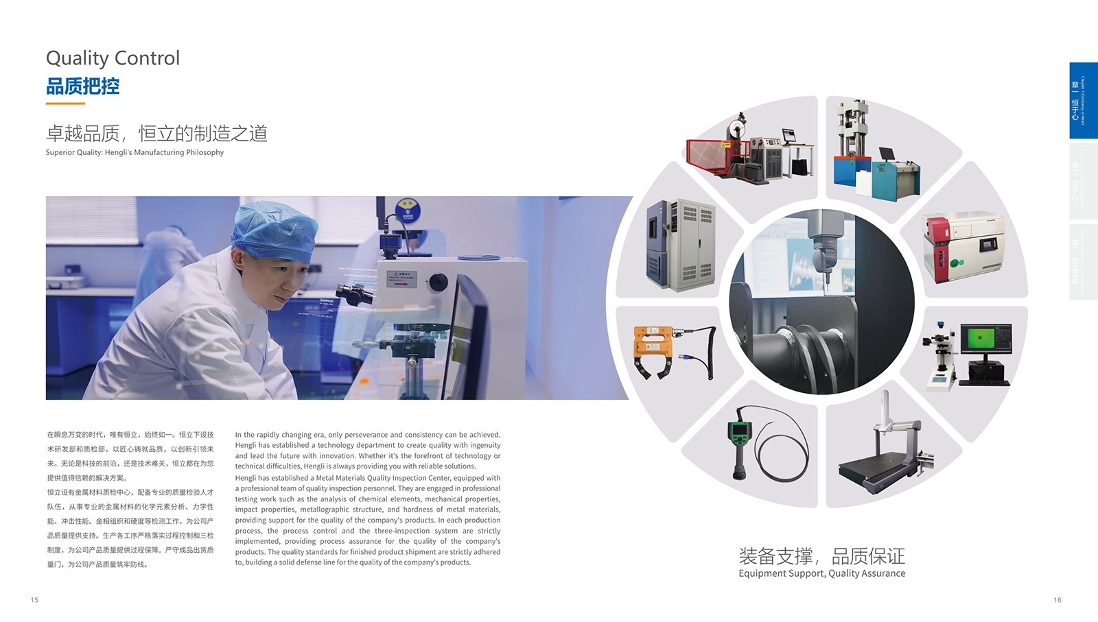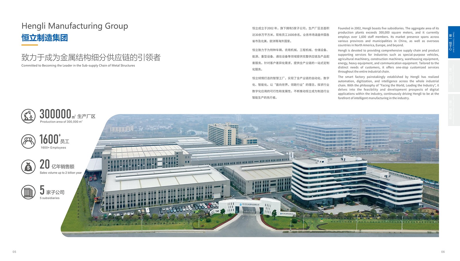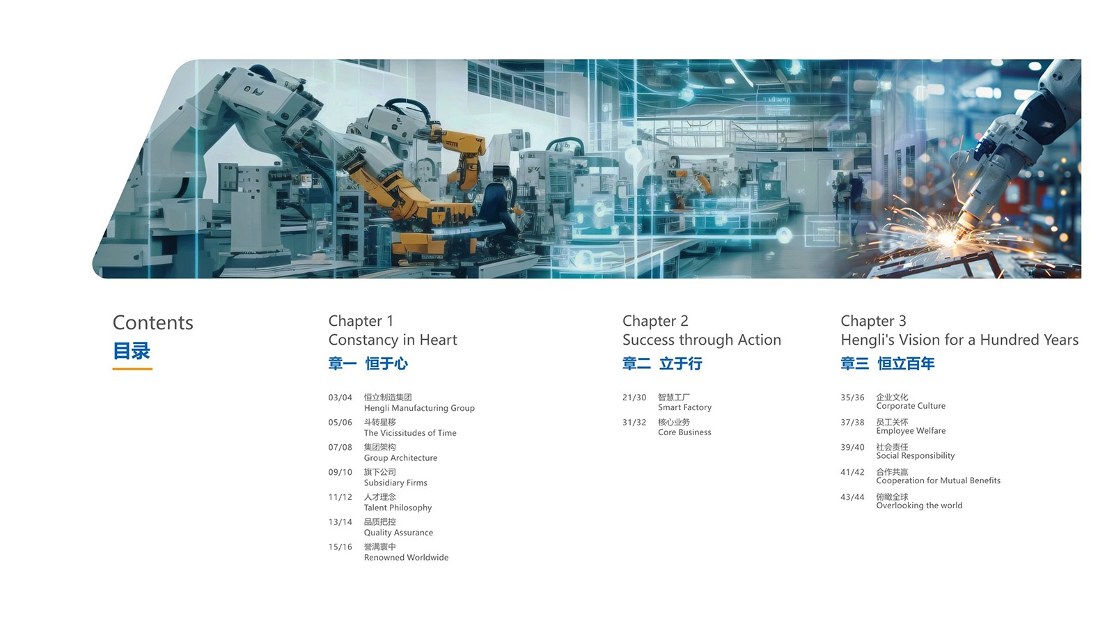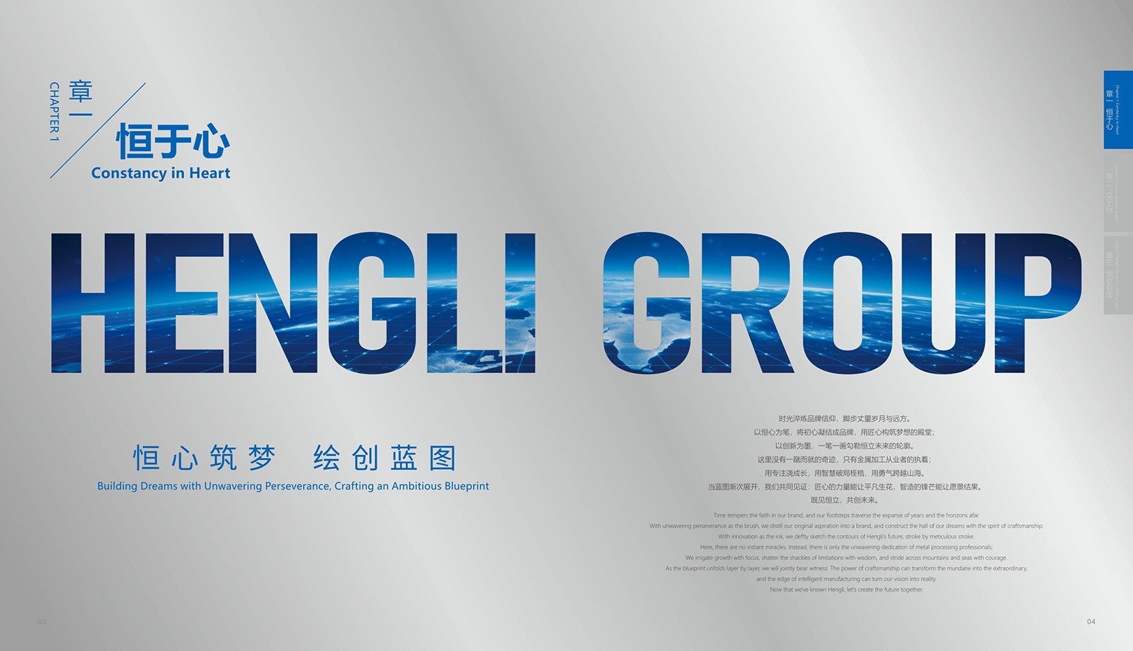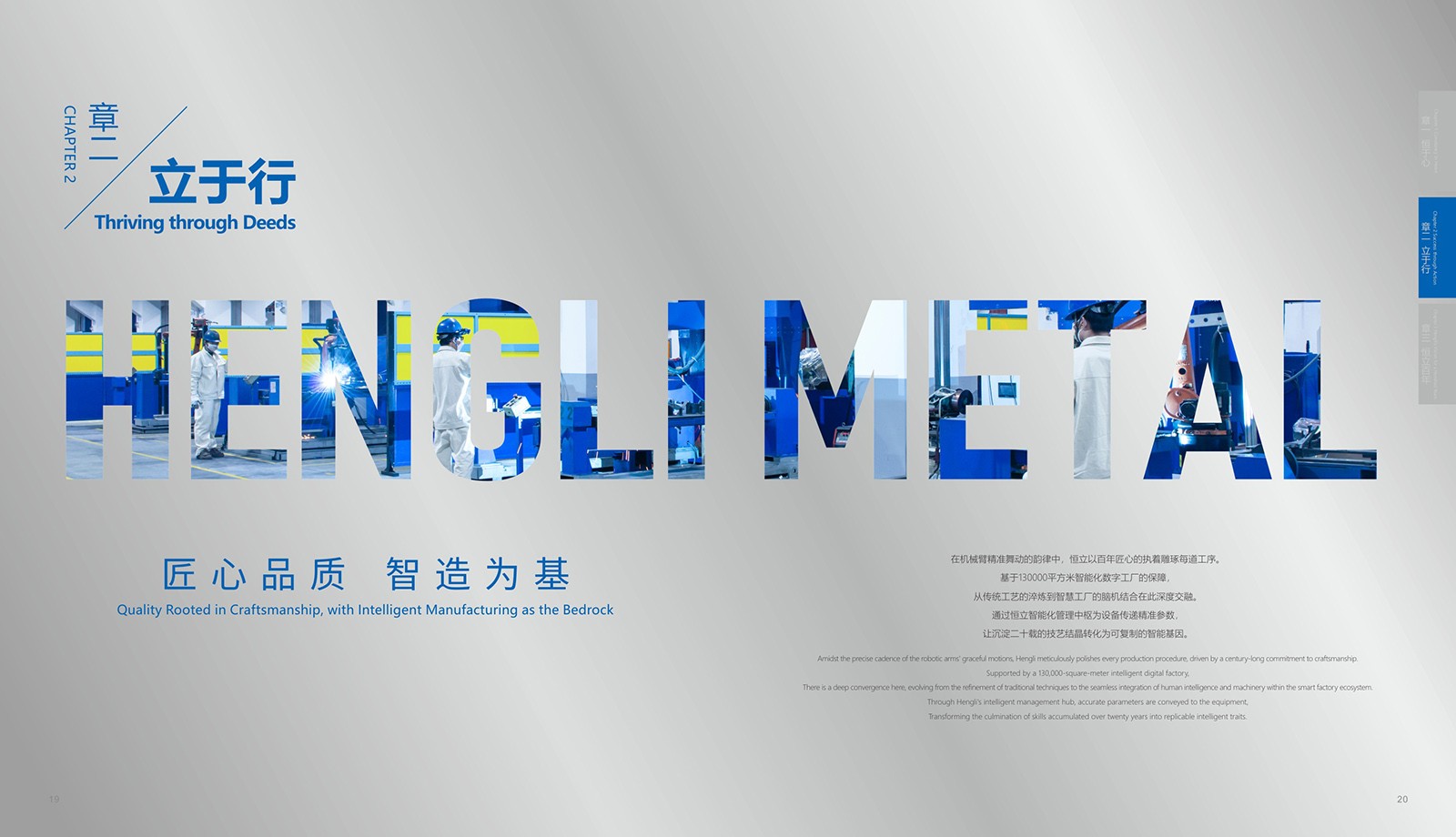 依據恒立的品牌色“恒立藍”為主色,加入印金和銀來體現金屬制造行業特色,采用科技感十足的設計,以科技藍與未來銀為主色調,搭配簡潔大氣的排版風格,使畫冊契合行業特點。